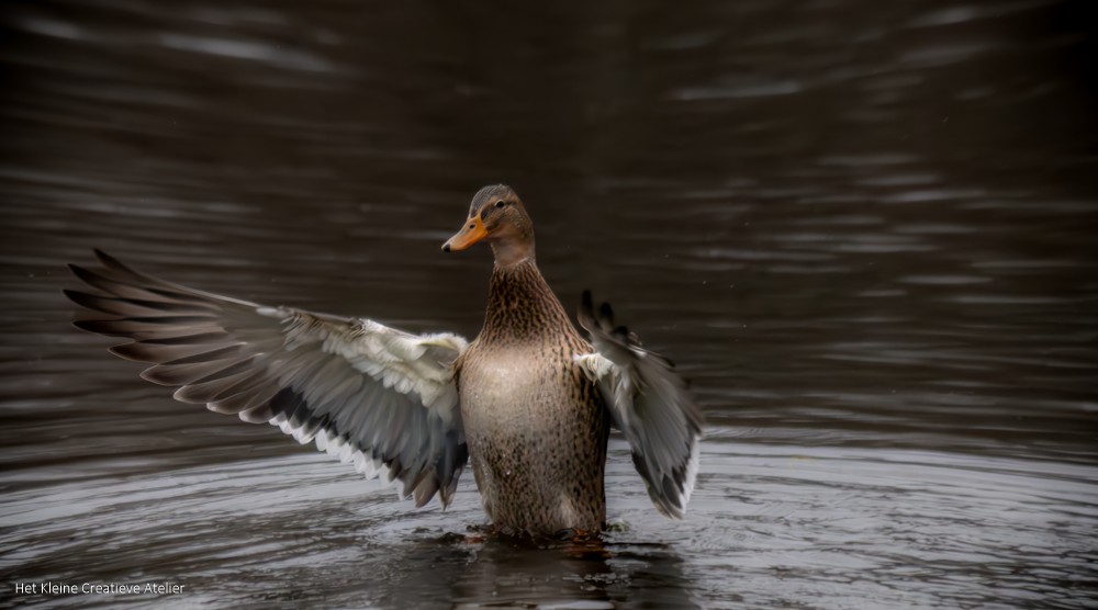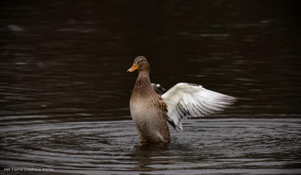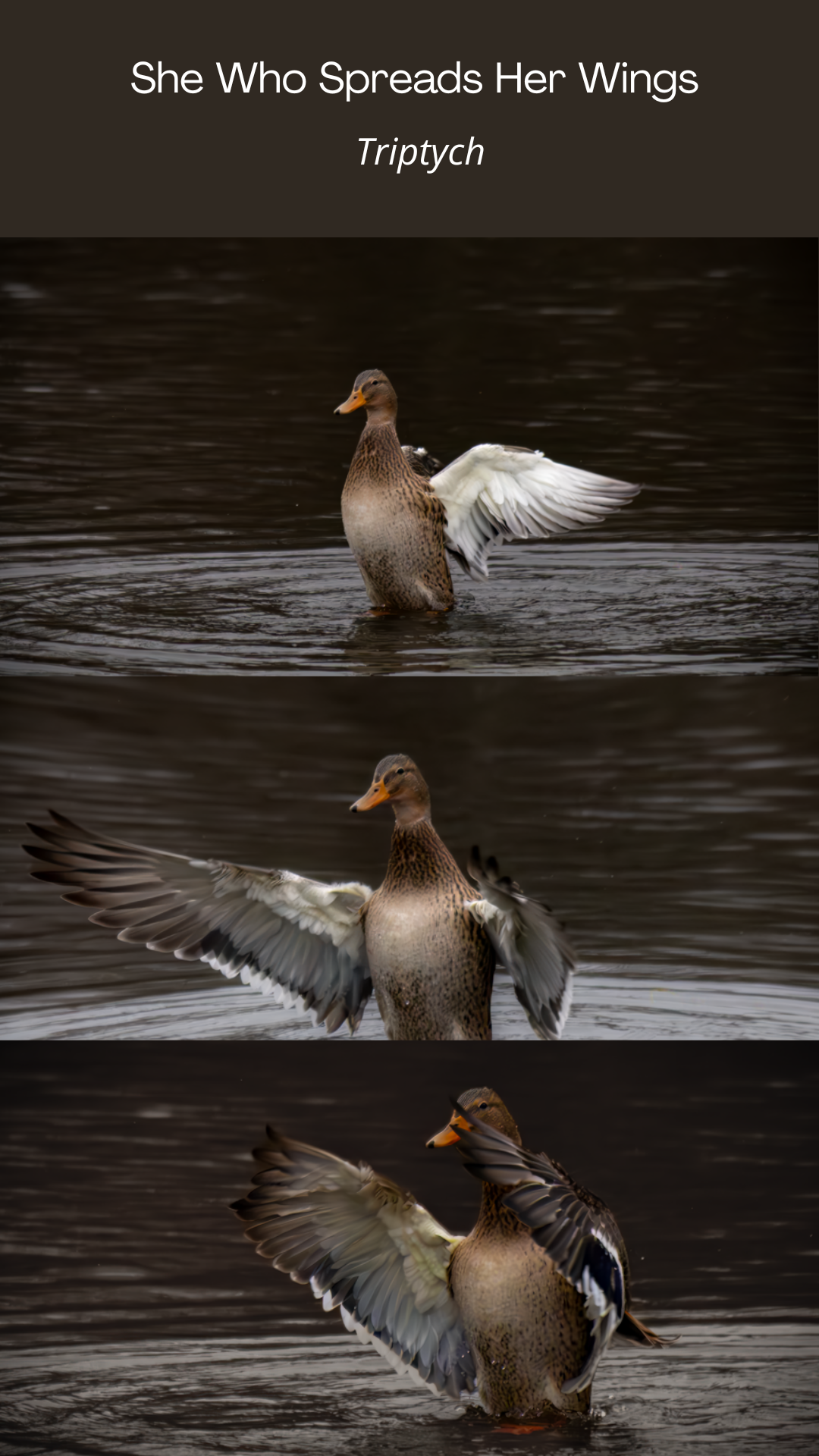 The female duck took a moment for herself. After preening, she slowly rose from the water and spread her wings — a movement that lasts only a few seconds.